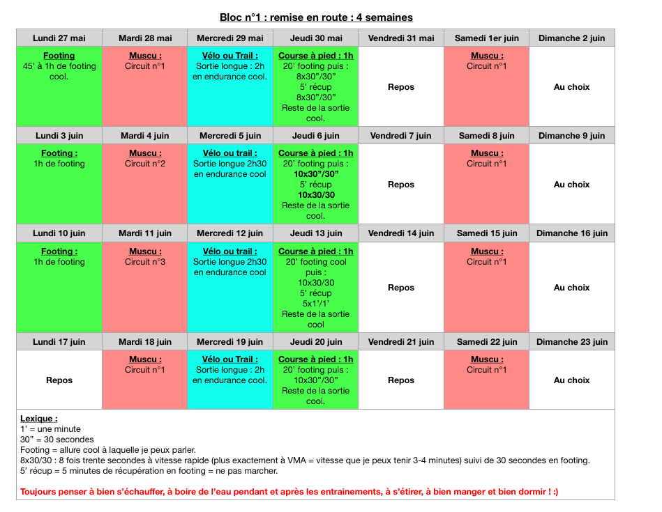 Si vous avez des objectifs particuliers, des compétitions cet été, n’hésitez pas à voir avec Hugo pour un plan plus adapté.