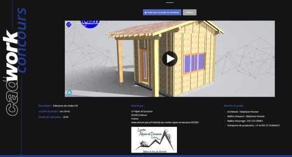 La classe de Terminale Technicien Constructeur Bois Ski participe à un concours organisé par l'entreprise CADWORK sur le projet de l'extension du chalet ESF des Orres. CADWORK conçoit et réalise des logiciels de dessins assistés par ordinateur. https://www.cadwork.com/indexL1a.jsp?null Pour les aider, il suffit de "Liker" le lien ci-dessous : http://cadcom.design/cadwork-concours/portfolio-item/lycee-alpes-et-durance-extension-de-chalet-esf-les-ores/ Merci d'avance pour eux… Pensez... Lire la Suite →